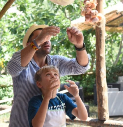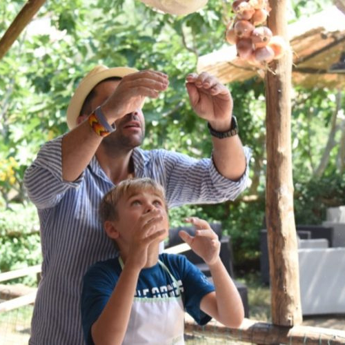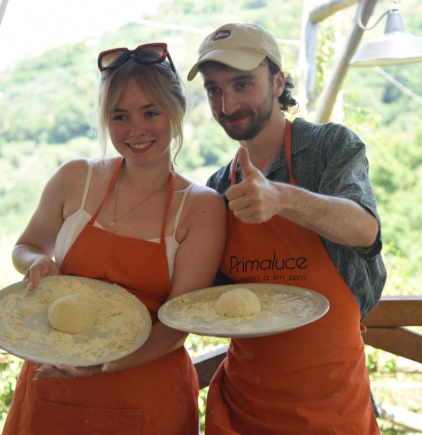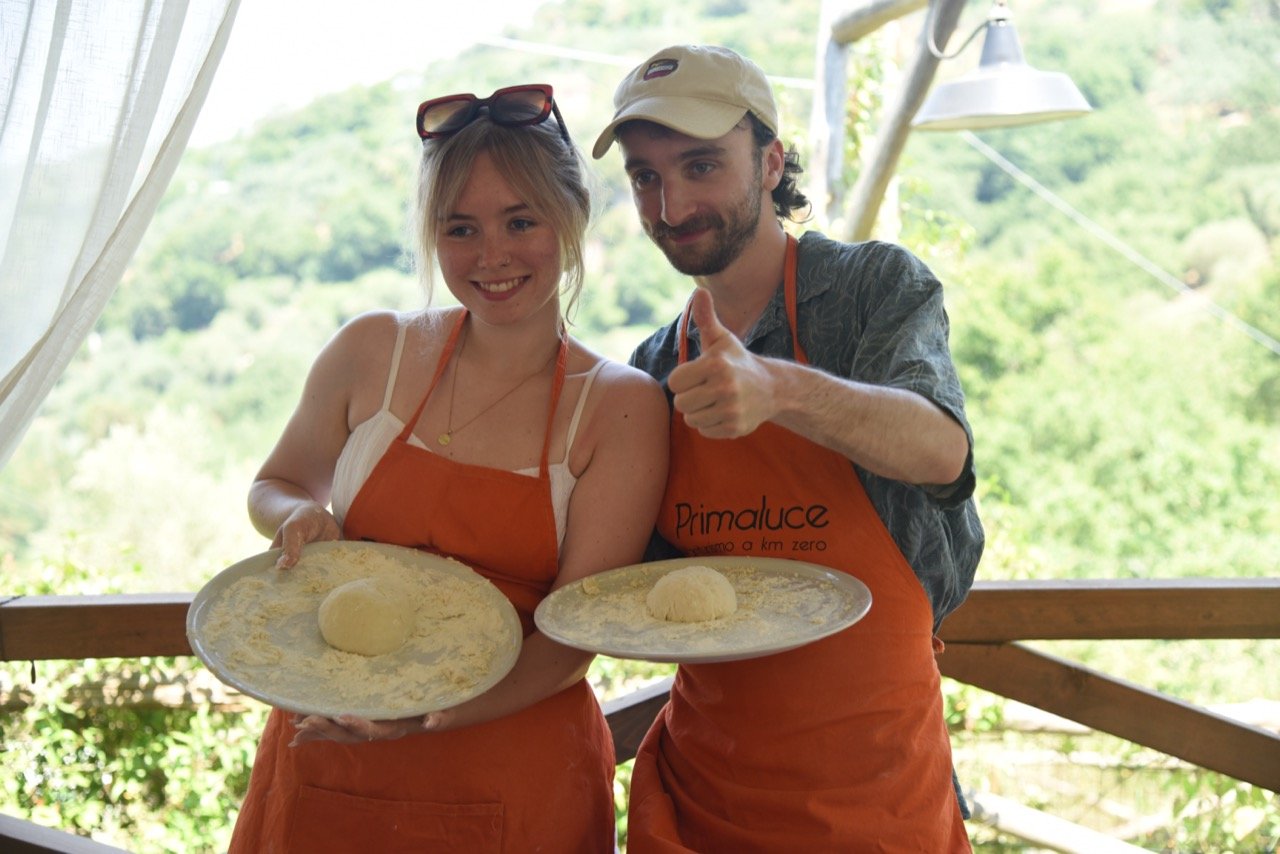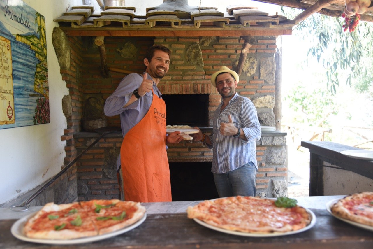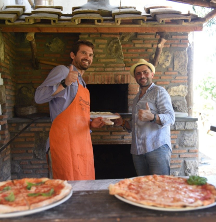 La nostra fattoria è situata sulle colline si Sorrento nella suggestiva frazione di Casarlano. La posizione strategica, tra il golfo di Napoli e quello di Salerno, ci regala una vista mozzafiato. Il pickup dal nostro meeting point (al centro di Sorrento) avverrà con la nostra courtesy car o i nostri minivan. Una volta arrivati qui in azienda vi verrà offerto un rinfrescante drink di benvenuto (succo di amarena o limone) fatto rigorosamente con in nostri frutti di stagione. Parleremo per qualche minuto della nostra ricetta che da generazioni è tramandata; inizierai quindi a preparare l'impasto per poi finalmente passare alla prezarazione della vera pizza, la quale una volta pronta verà infornata nel nostro tradizionale forno per le pizze. Per concludere non puoi perderti il dessert preparato dalle agili mani della giovane Anna, ed il limoncello fatto da nonna Angela.